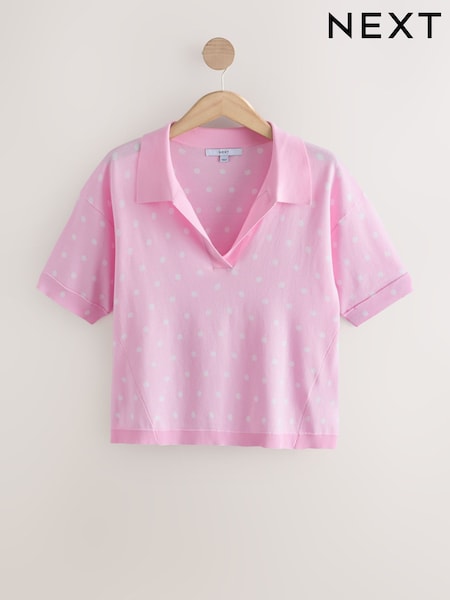 Light Pink Polka Dot Cotton Rich Soft Touch Knitted Polo Top