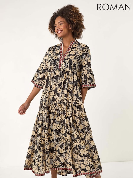 Roman Black Floral Print Border 100% Cotton Maxi Dress