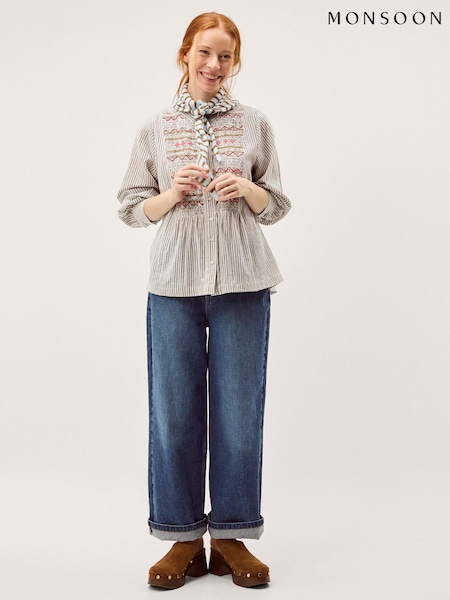 Monsoon Black Hettie Embroidered Shirred Stripe Shirt