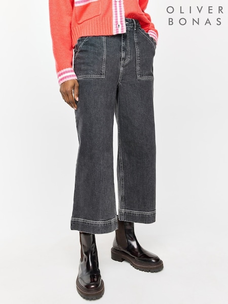 Oliver Bonas Black Denim Scalloped Pocket Cropped Wide Leg Jeans