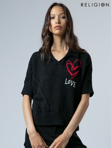 Religion Black Eloise Neck Crochet Short Sleeved Knit Polo Shirt With Love Embroidery