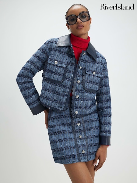 River Island Blue Boucle Faux Leather Trim Trophy Jacket