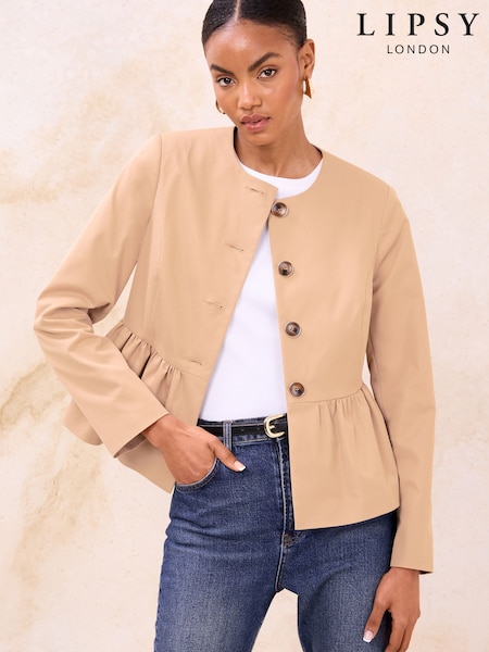 Lipsy Camel Brown Collarless Peplum Hem Jacket