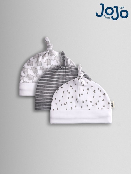 JoJo Maman Bébé Grey 3-Pack Elephant, Stripe & Star Baby Hats
