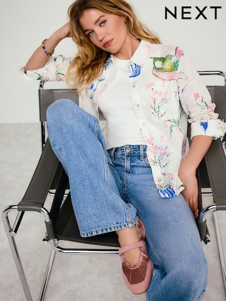 Ecru Abstract Vase Print Relaxed Long Sleeve Shirt With Linen