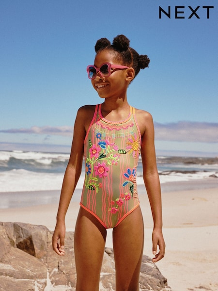 Orange Floral Embroidered Double Strap Swimsuit (3-16yrs)