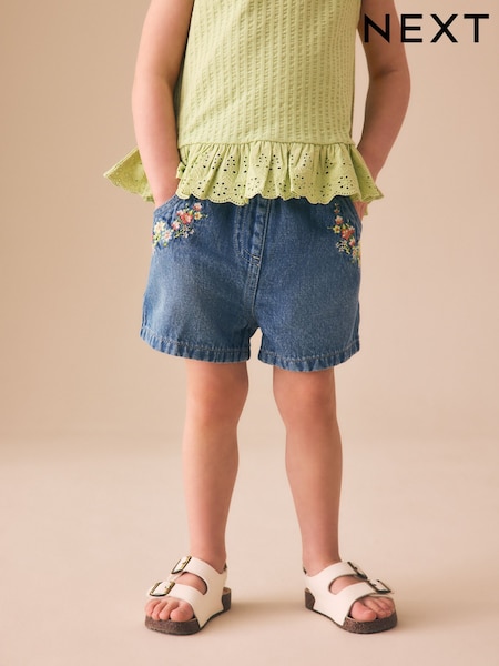 Mid Blue Denim Embroidered Flower Pullon Shorts (3mths-7yrs)