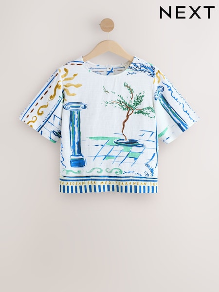 White/Blue Scenic Border Print Short Sleeve Boxy T-Shirt with Linen