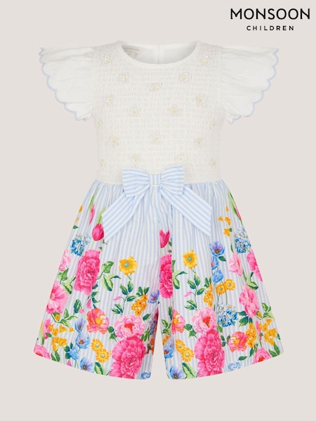 Monsoon Blue Floral Print Bow Shirred Playsuit