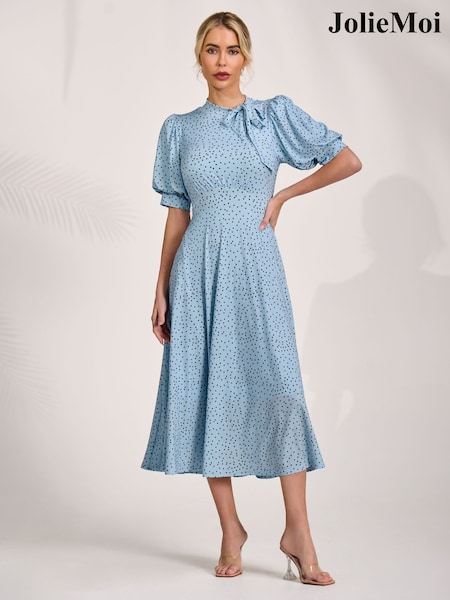 Jolie Moi Blue Tie Neck Puffy Sleeve Jersey Midi Dress