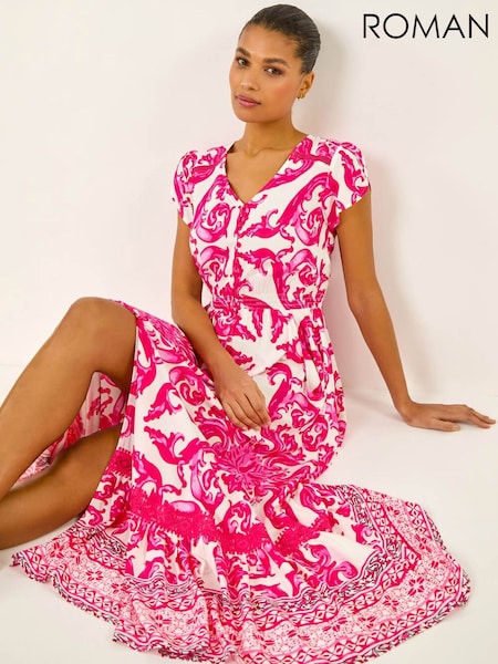 Roman Red Floral Print Tea Midi Dress
