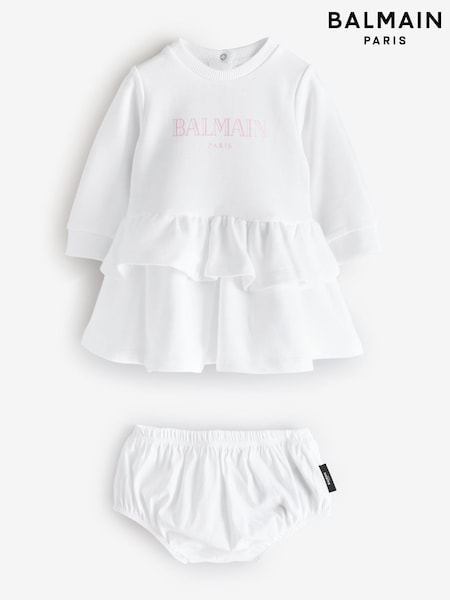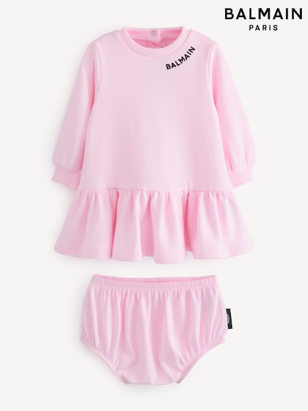 Balmain Baby Pink Logo Frill Sleeve Dress and Knickers Set