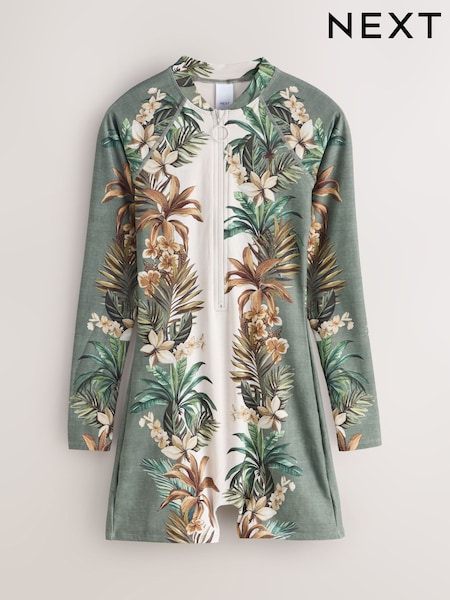 Cream/Khaki Green Palm Long Sleeve Rash Swimsuit