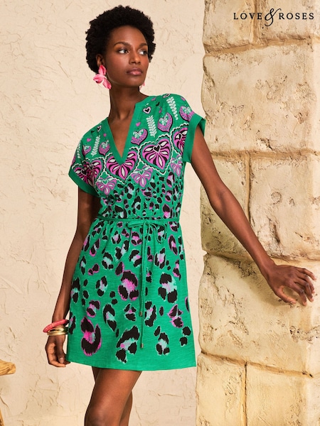 Love & Roses Bright Green Animal Print Notch Neck Mini T-Shirt Dress