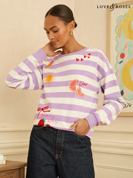 Love & Roses Lilac Purple Stripe Embroidered Sweat Top