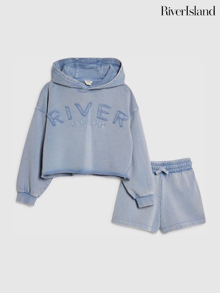 River Island Blue Washed River Hoodie & Short Set