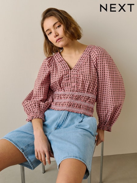 Brown/Red Heart Gingham Smocked V-Neck Long Sleeve Blouse